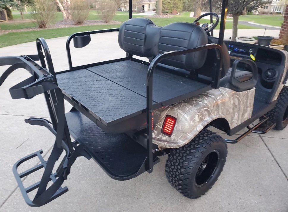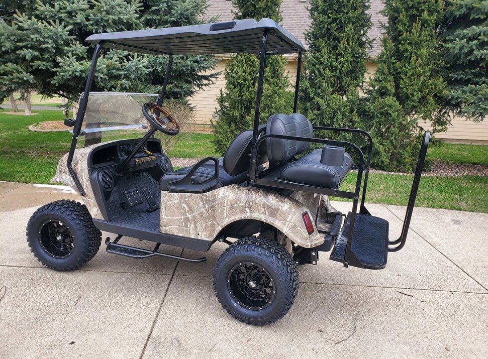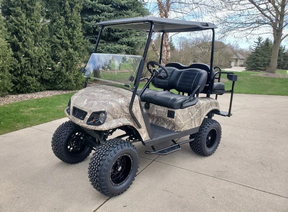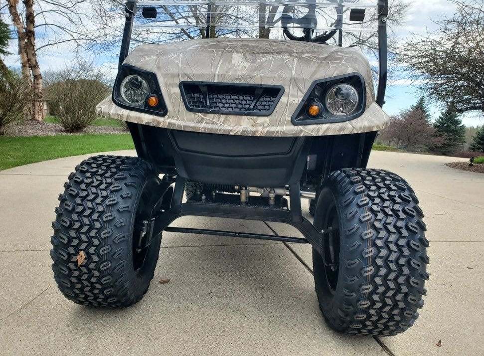 The E-Z-GO TXT Elite Realtree Camo Golf Cart in the image is a lifted model with a custom camouflage finish and off-road tires. While specific modifications may vary, here are the general specifications for an E-Z-GO TXT Elite golf cart, which can be powered by either a 48V electric system or a gas engine: