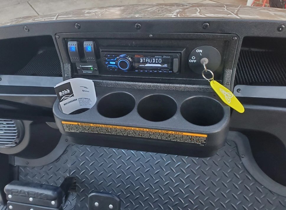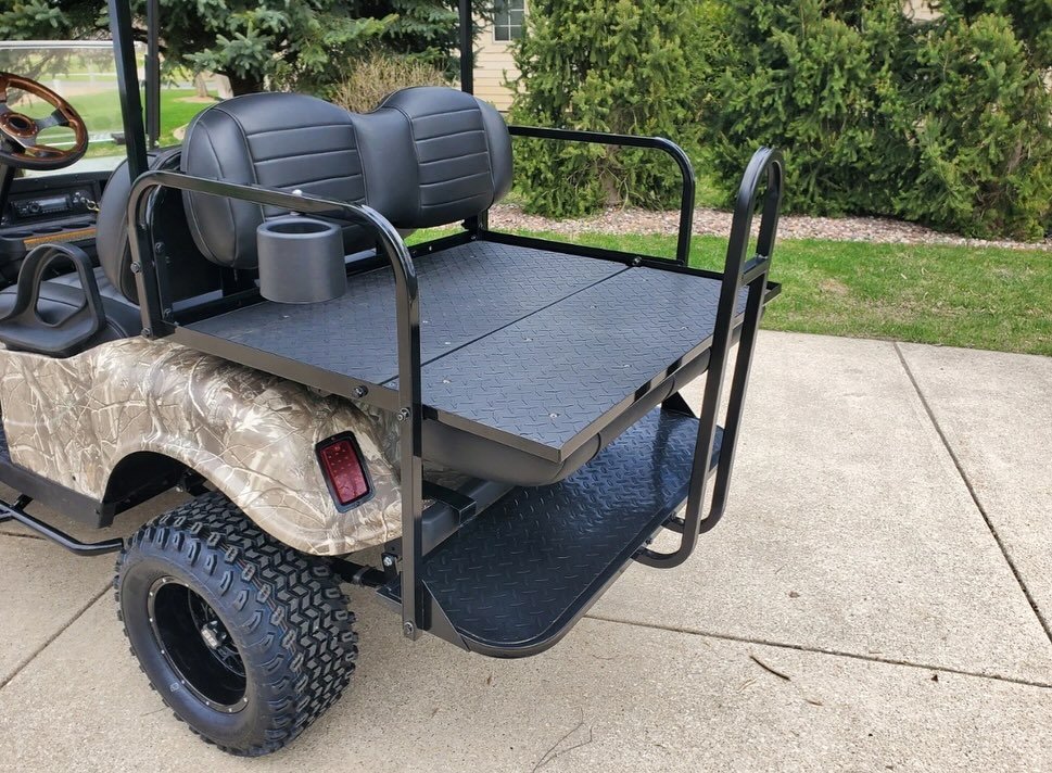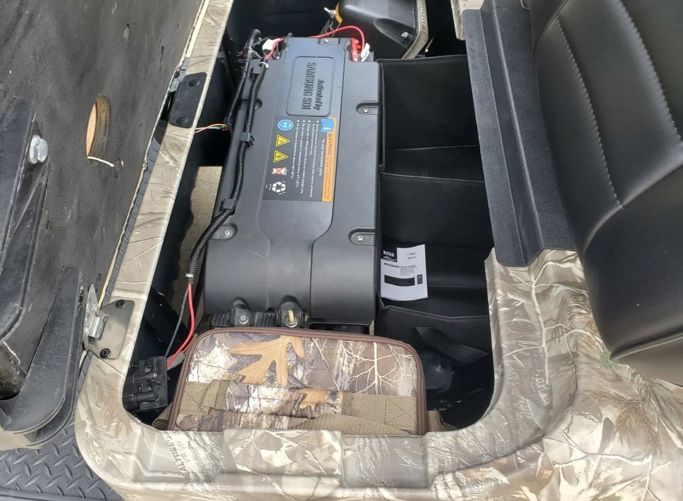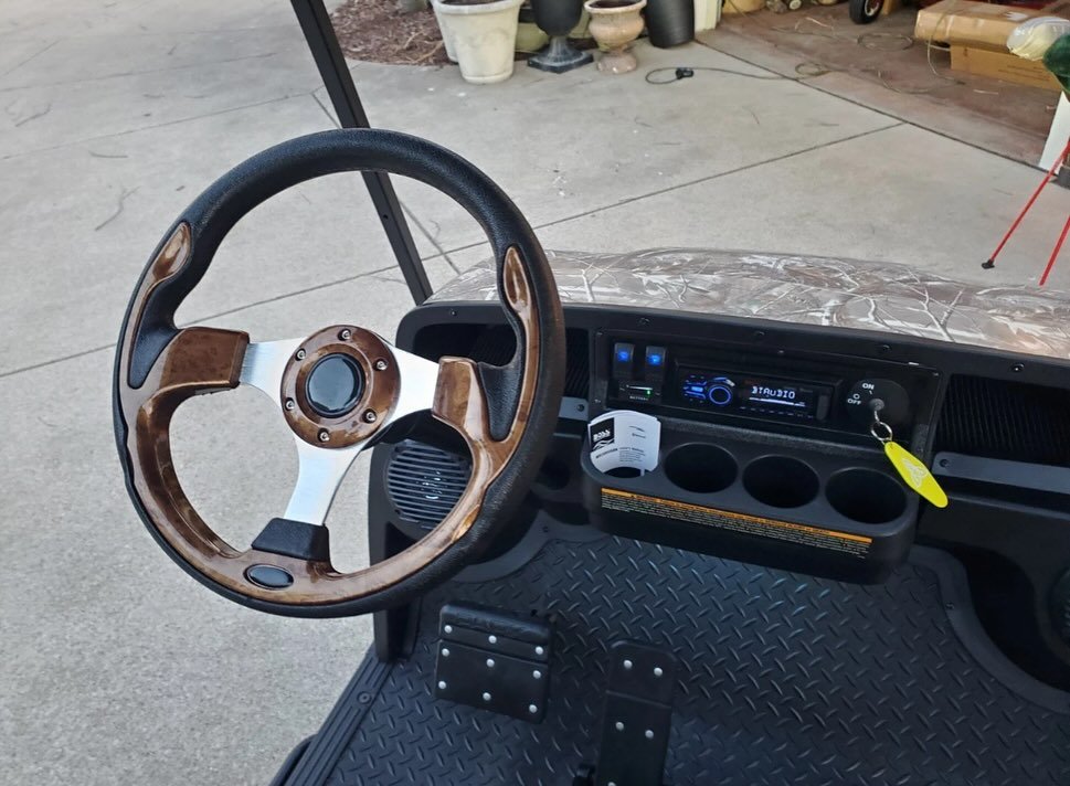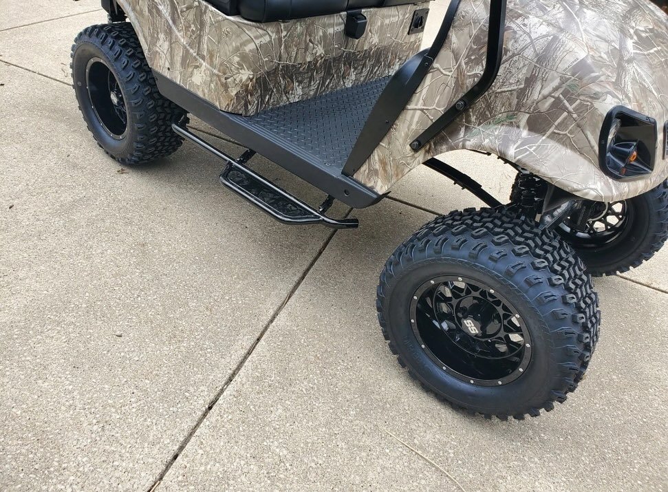 The E-Z-GO TXT Elite Realtree Camo Golf Cart in the image is a lifted model with a custom camouflage finish and off-road tires. While specific modifications may vary, here are the general specifications for an E-Z-GO TXT Elite golf cart, which can be powered by either a 48V electric system or a gas engine: