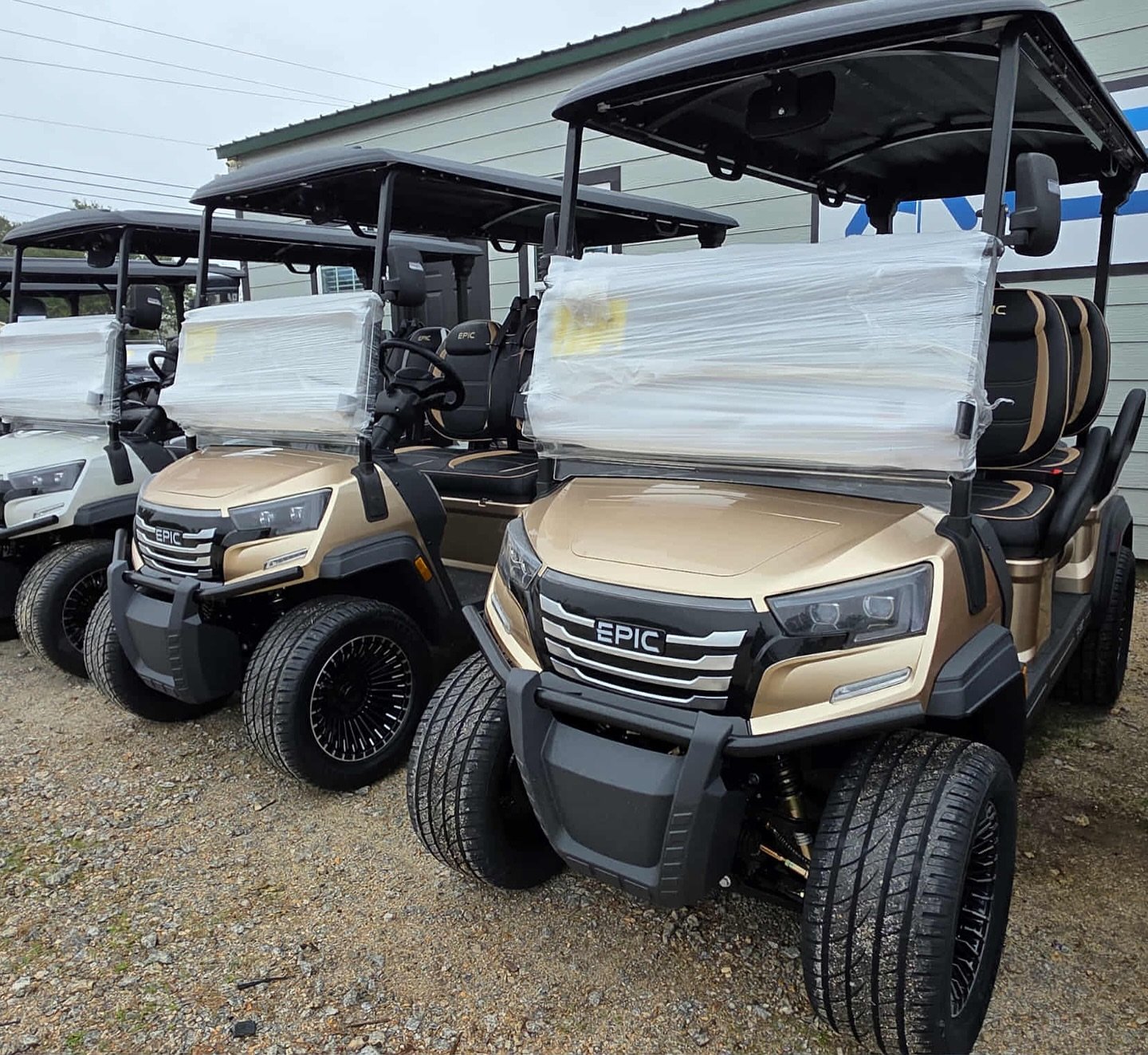 The vehicle in the image is an Epic E40FX golf cart. Key specifications and features include: