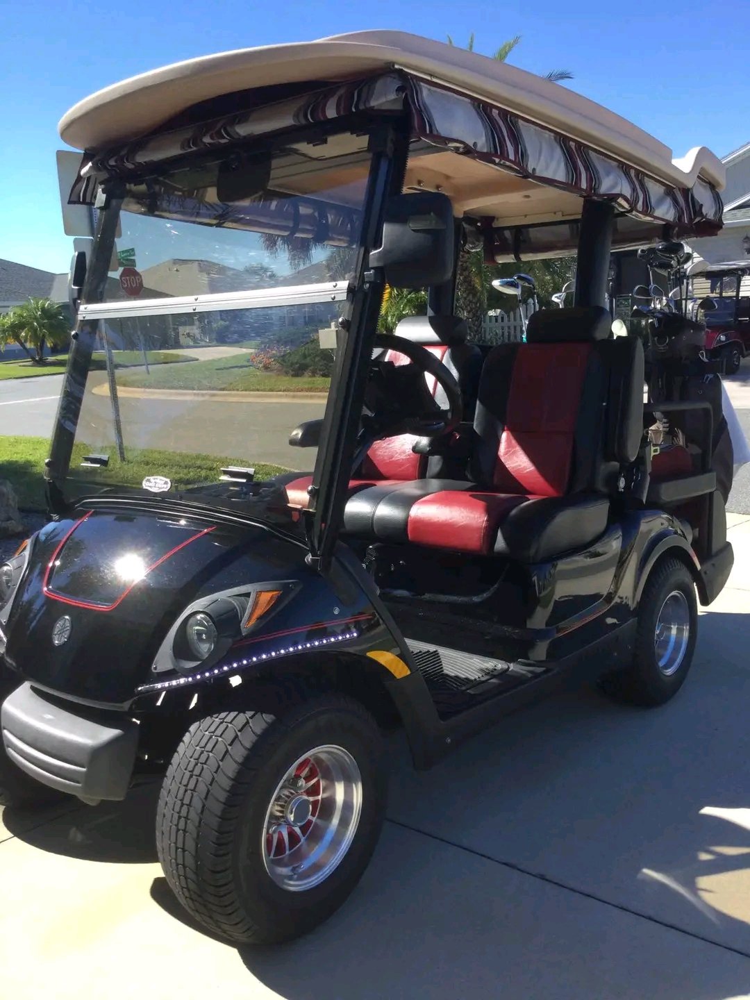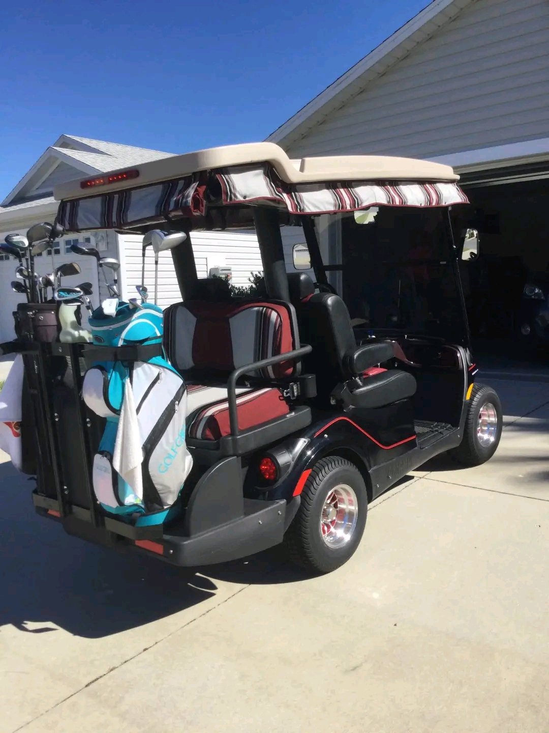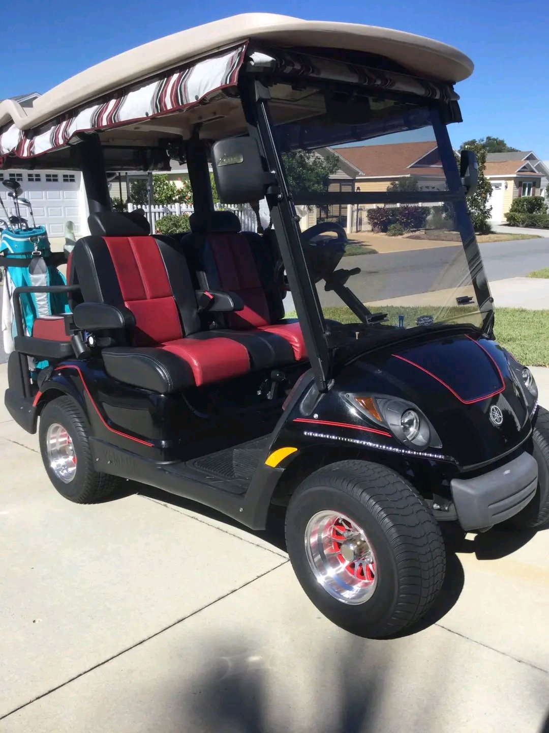 Yamaha Drive2 golf cart, a gas-powered model, featuring several aftermarket modifications such as custom two-tone seats, custom wheels, and an extended top.