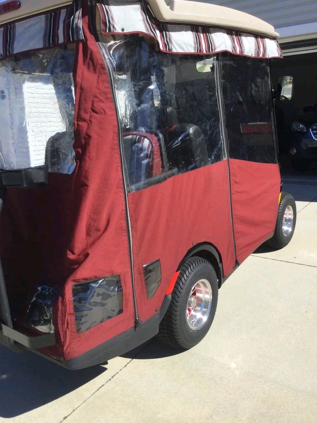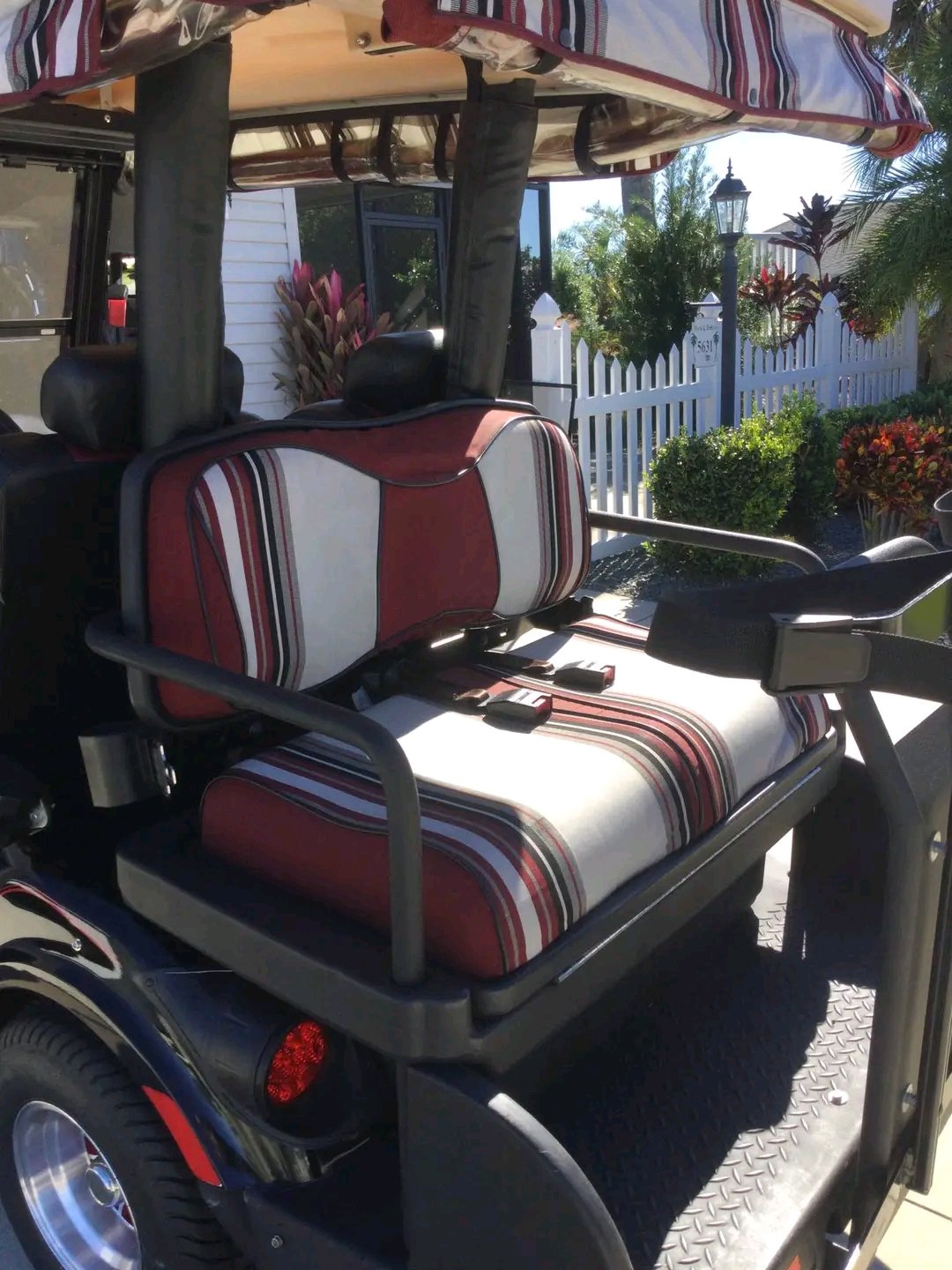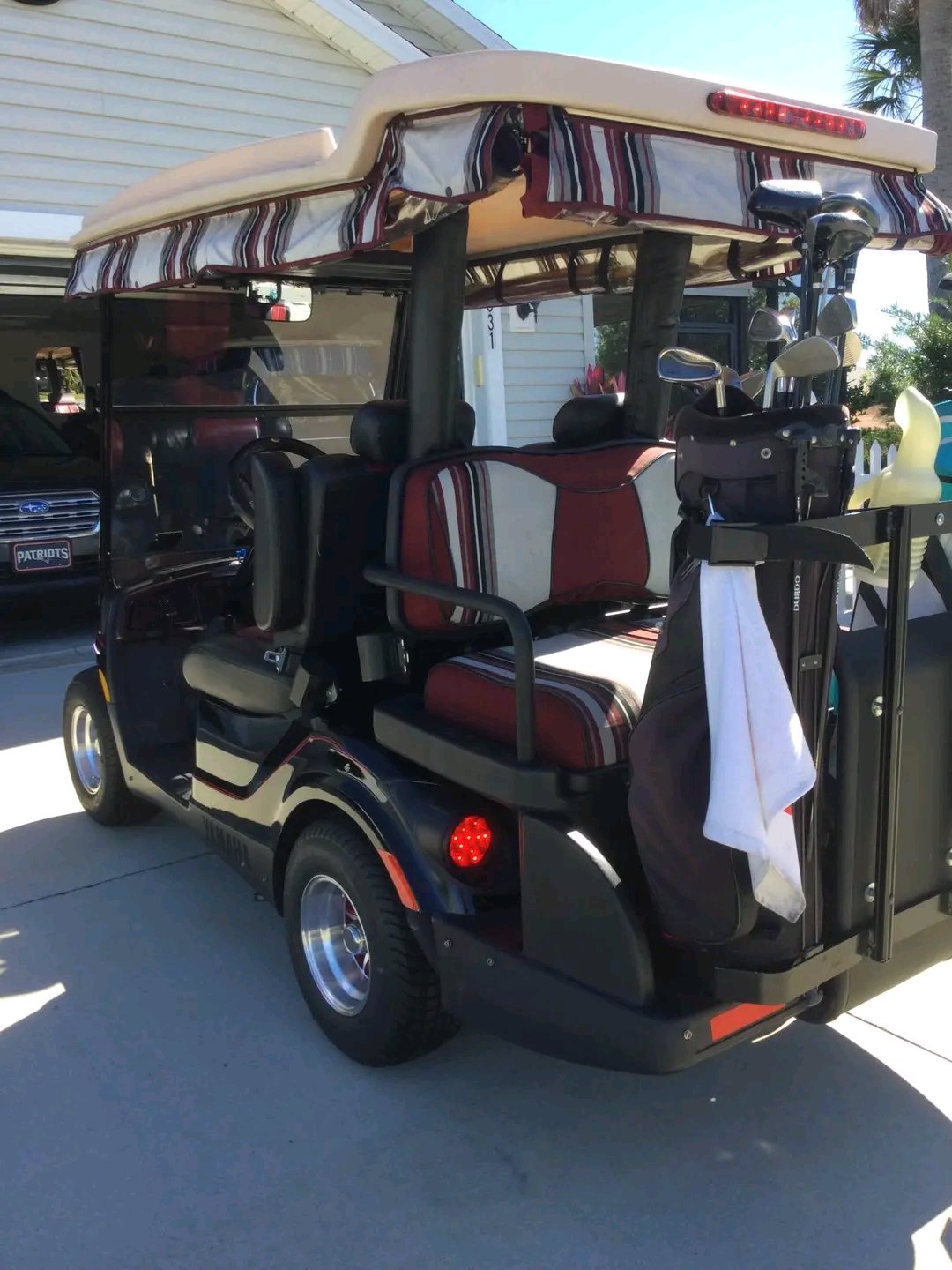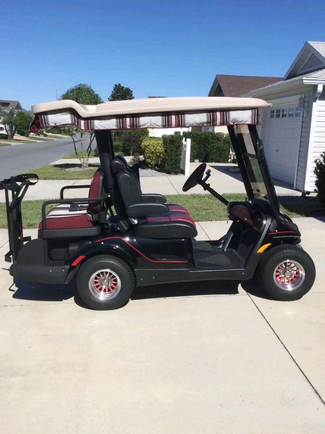 Yamaha Drive2 golf cart, a gas-powered model, featuring several aftermarket modifications such as custom two-tone seats, custom wheels, and an extended top.
